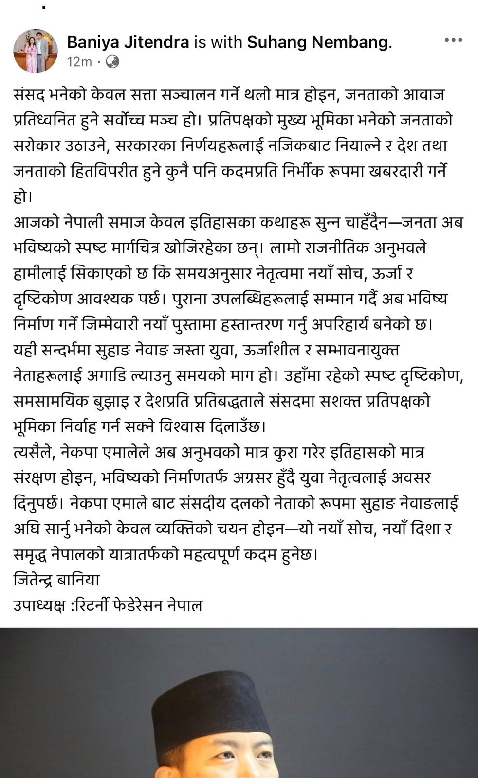 रिटर्नी फेडेरेसनका नेपालको उपाध्यक्ष जितेन्द्र बानियाले सुहांग नेम्हांगलाई संसदीय दलको नेताको रुपमा अघि सार्नुपर्ने बताएका छन । सामाजिक संजालमा आफ्नो विचार राख्दैनेकपा एमालेको जनसंगठन रिटर्नी फेडेरेसनका उपाध्यक्ष रहेका बानियाले “भविष्यको निर्माणतर्फ अग्रसर हुदैं युवा नेतृत्वलाई अवसर दिनुपर्छ” लेखेका छन । समयअनुसार नेतृत्वमा नयाँ सोच , उर्जा र दृष्टिकोण आवश्यक पर्छ भन्दै उनले पुराना उपलब्धीहरुलाई सम्मान गर्दे अव भविष्य निर्माण गर्ने जिम्मेवारी नयाँ पुस्तामा हस्तान्तरण गर्नु अपरिहार्य बनेको भनेका छन ।